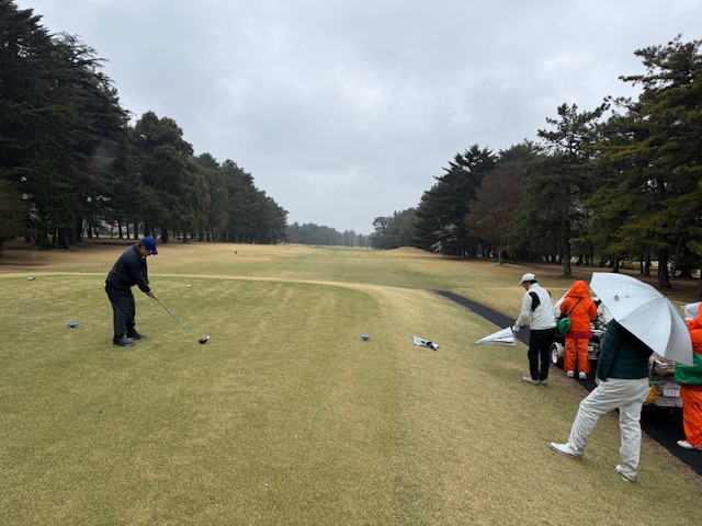 桜が日本一なのではないか!の鷹之台カンツリー倶楽部にやって来ました。が、外は弱めながらも冷たい雨が降っています。10時過ぎのスタートですが、4人が早めに集合します。