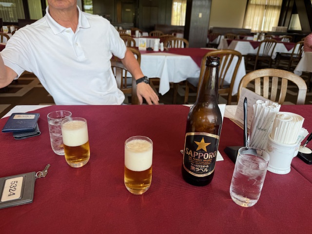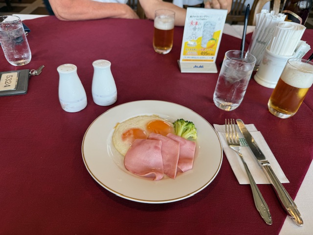 着替えて、レストランへ。雰囲気があります。ハムエッグとサッポロ大瓶スタートです。