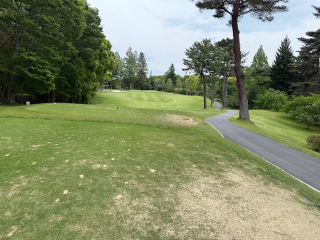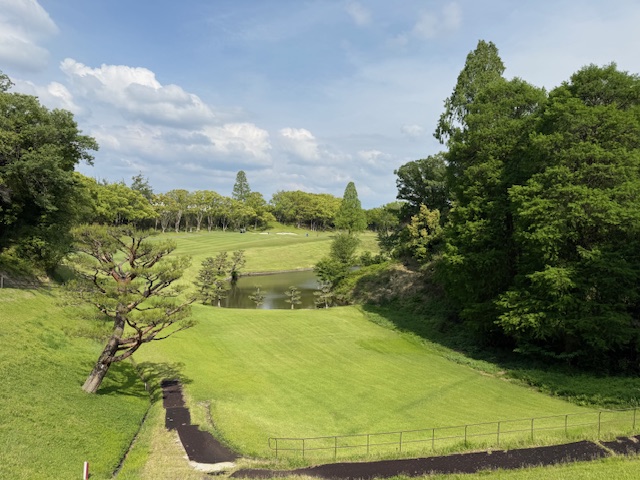 17番奈良国の名物ホールの445yミドルは、ドライバーは右ラフへ。3uで打つも左手前。2.3mに3オンしたが入らずボギー。
