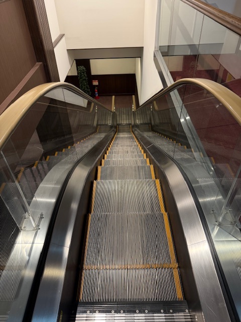 レストランに行きます。あ、エスカレーターがありました。下にお風呂があるそうですが、そこから上がるのがきついとの声で設置されたそうです。福岡の和白にもエスカレーターはありましたね。