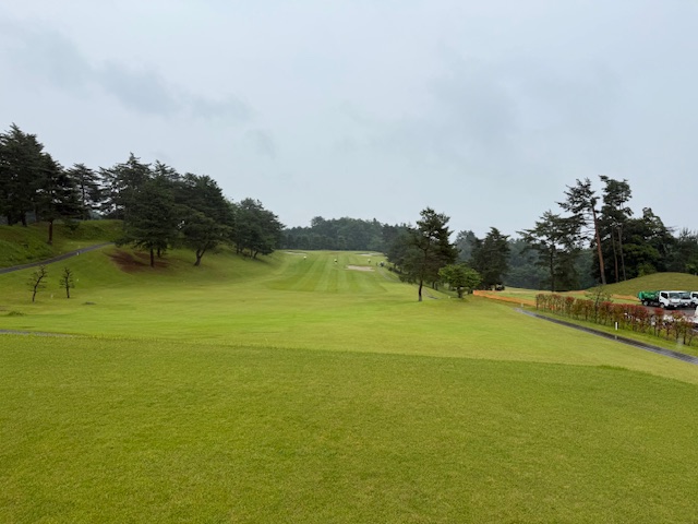 合羽を着て、東からスタート。今日はニューグリーンで使用ティは青から。