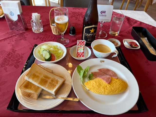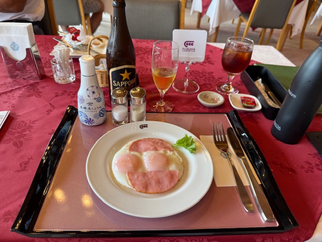 まずは着替えてレストランへ。もう縁のK.TさんとK.Kさんはお席に着いておられます。スルー(軽食をはさむ)で廻るそうなので黄金水と洋定食と単品ハムエッグを食します。