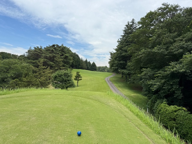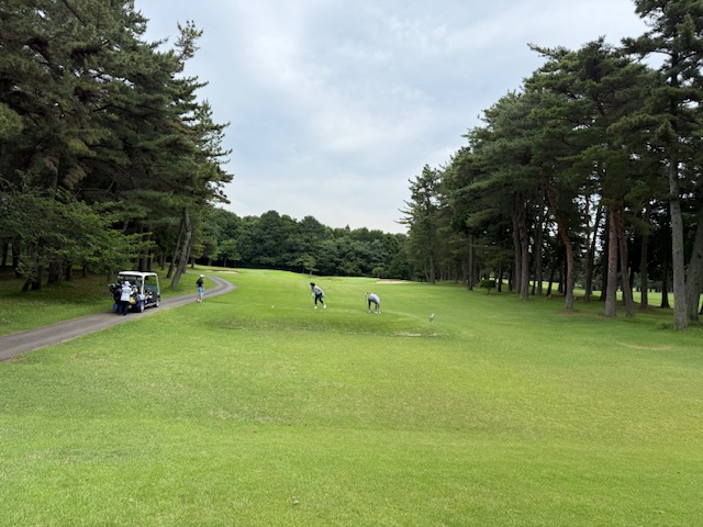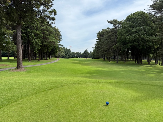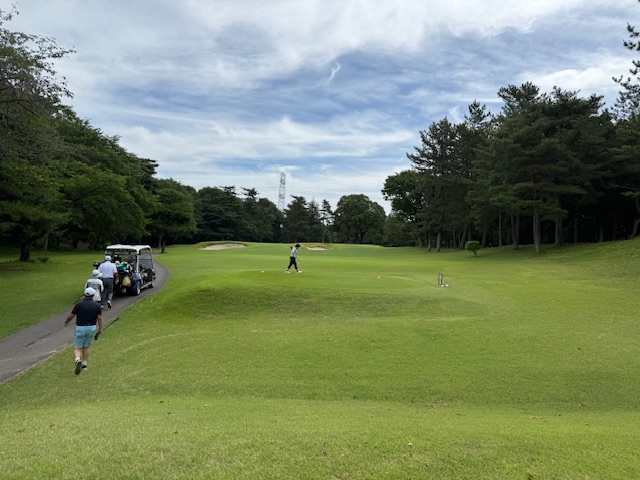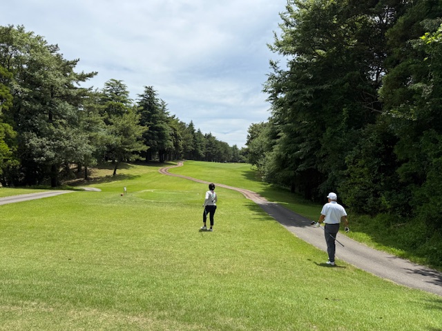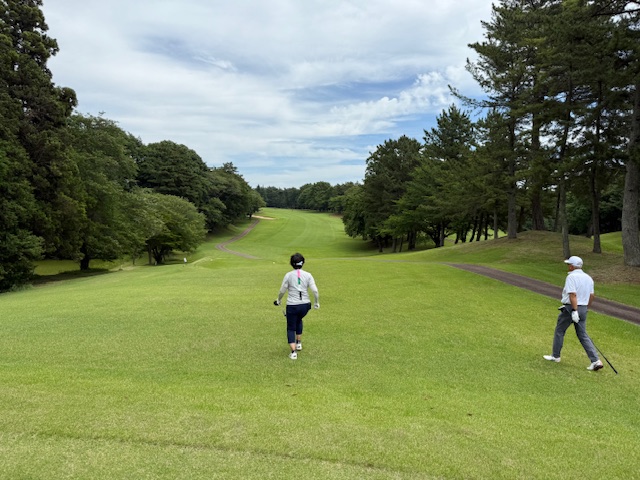 我々はイン10番から。使用ティは私とK.Tさんは青。レジェンドK.Kさんと今日ご一緒してくださる内田真由美プロは白ティからです。