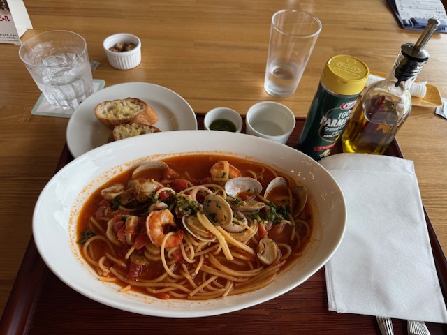 ランチは、今日もトマト味のスープ的パスタを食す。アルデンテでナイス麺とナイスな味。素晴らしい。