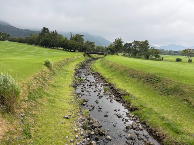 9番419yミドルは、ドライバーは竜巻球。8アイアンでレイアップ。ボギー。