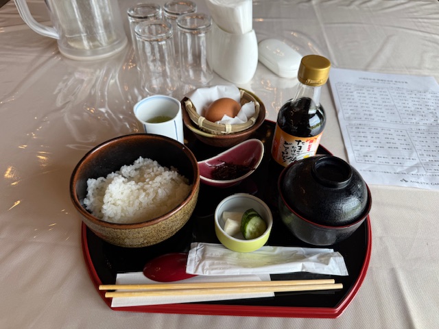 まずは、レストランでハムエッグを頼もうとしたら、特別メニューしかないそうで今日はないそう。で、卵かけご飯セットをいただく。まずまず。