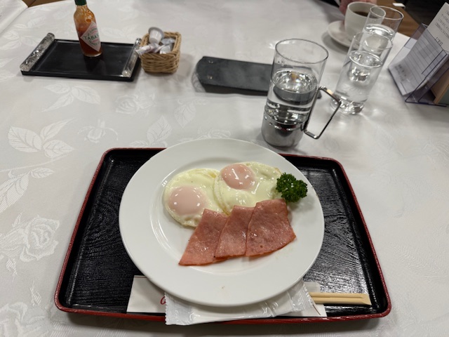 到着後、まずは、渡辺副支配人とレストランでモーニングブレイクです。