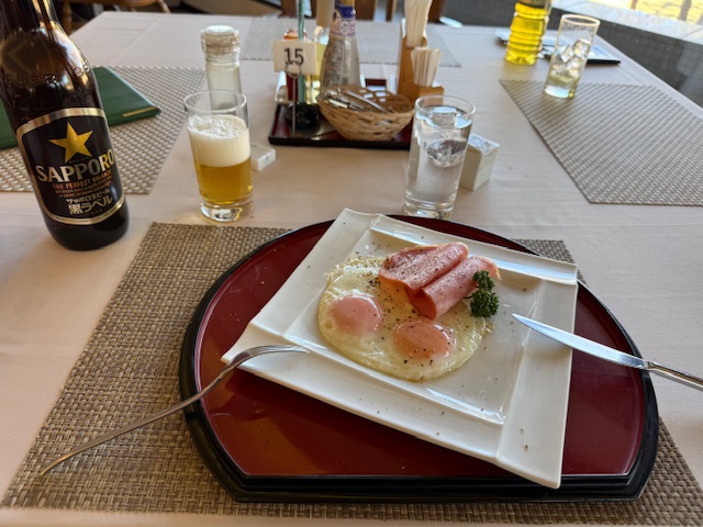 いつものようにレストランでハムエッグを食しながらミーティングをし、パターを転がして中コースから。Aグリーンで、ティは青です。今日は青だから、頑張って頂戴。