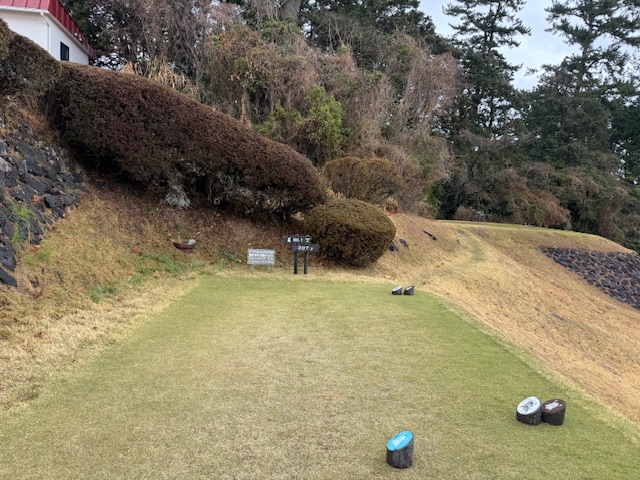 1番409y打ち下ろしミドルは、ドライバー、6アイアンで左へ。寄らず入らず。