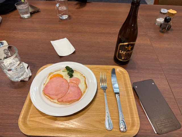 ハムエッグを食しながら、皆さんとワイワイ。