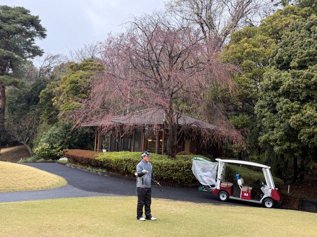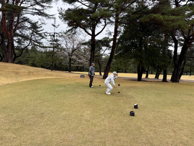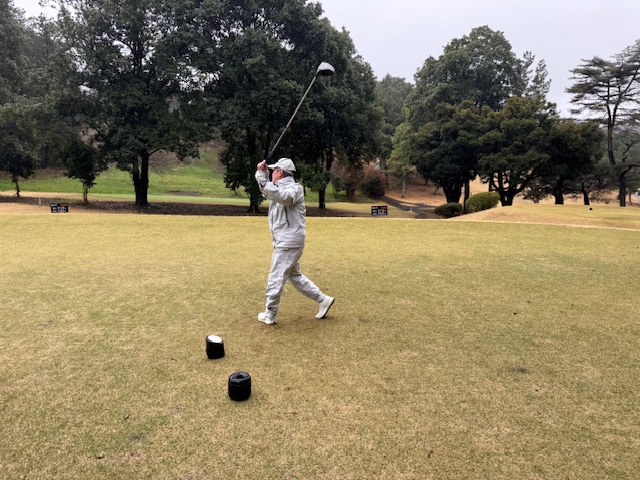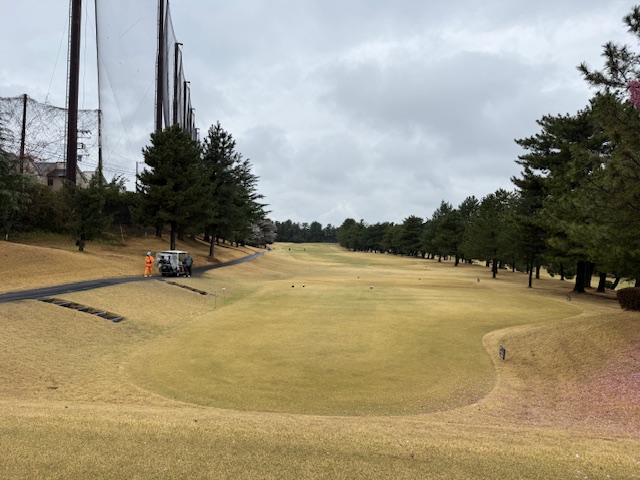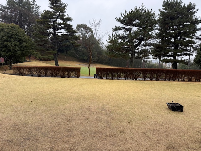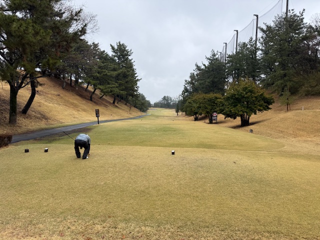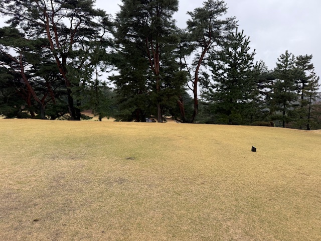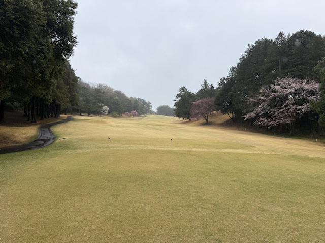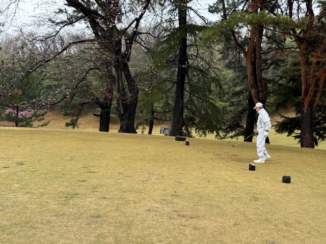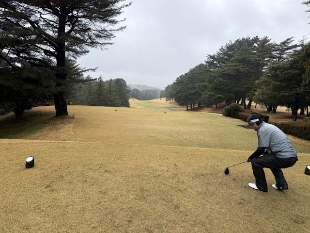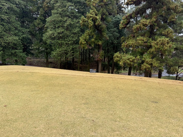 合羽を着て、パターを転がして、インから。今日は高麗グリーンです。ここ最近は高麗使用でのプレーが多いです。白ティで進行します。