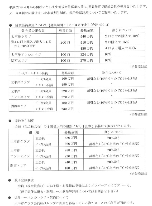 ※縁故募集(募集期間 2018年1月から3月末 募集口数 合計250口 募集金額 正会員 1口目より10%割引 その他:1口目より10%相当のTCチケット進呈)、家族割引制度、複数購入割引制度、親子登録制度もございます。各詳細につきましては弊社営業スタッフにお問合せ下さい。