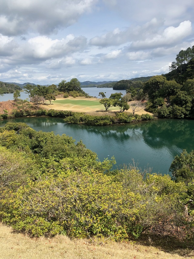 まず3番ですが、大村湾の入江を越える、パサージュ琴海を代表する最も美しいショートホールになります。波の無い入江を渡る風が作る波紋を見ながら風の方向を読んで打つのがポイントの打ち下ろしホールです。
