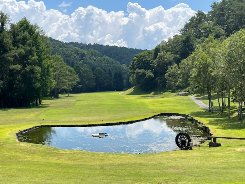 スタートホールの10番は打ち下ろしで、打ち上げの11番ホールを経ていったんクラブハウスへ戻るようなレイアウトになっています。あがり3ホールの16番から18番は難しいと言われており、17番ロングは2打目の落としどころやグリーン前に池が待ち構えているホールです。グリーン前の池にはゴルフ場には珍しく水車があり、これがこのゴルフ場の名物になっています。このホールはボギー。スコアの方は出だしがパーだったものの、トリさんも3ホールあり、前半は49でした。